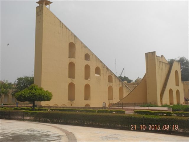 Samrat Yantra, looking south east, families gather round another sundial for an explanation.